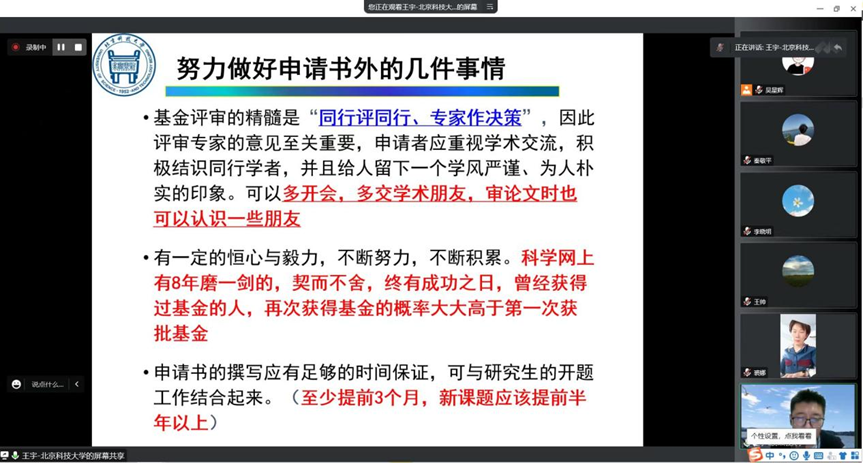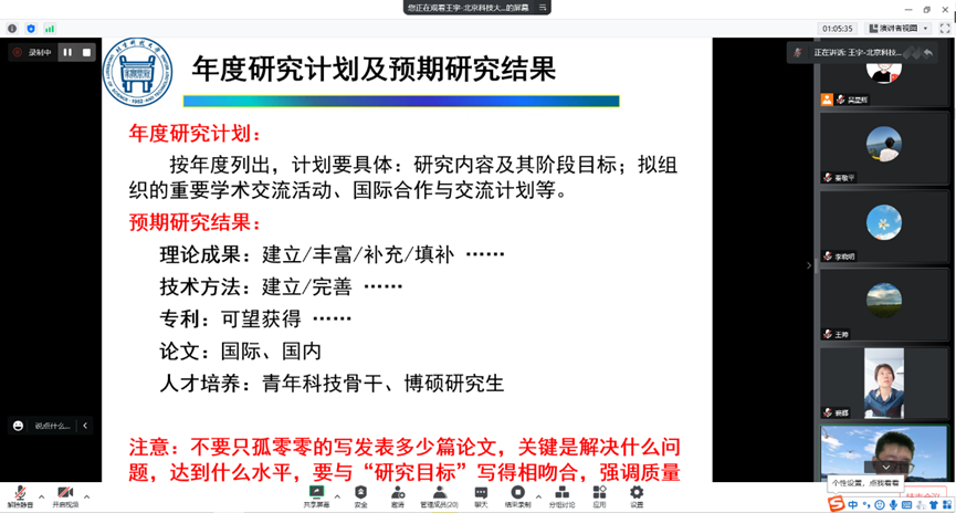 2022年11月17日下午,beat365召开了国家自然科学基金线上辅导会。此次辅导会特邀北京科技大学王宇教授进行基金申报辅导。会议由副院长裘娜主持,全体员工参会并听取专家意见。
