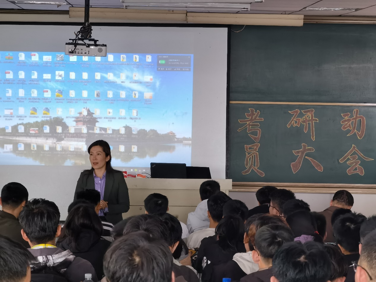 最后,裘娜院长对同学们能够参会并且有决心考研表示欣慰,又语重心长地指出了考研对同学来今后人生发展的意义。她表示,考研是自我能力肯定、自我价值彰显的表现,同时也是对同学们毅力的一种考验,希望同学们宁可做过,不愿错过。裘娜院长就考研给出三点建议:一是评估自我,准确定位,全面客观的进行自我评价,报考适合的学校;二是进行地区、学校和专业的选择,量力而行,既不要好高骛远也不要妄自菲薄,以能顺利考上研究生为最终目标;三是谨慎选择报考专硕和学硕,要知己知彼,不能盲从。她希望同学们明白考研是一段艰辛的路程,外界可能会有很多干扰,但仍然要负重前行。