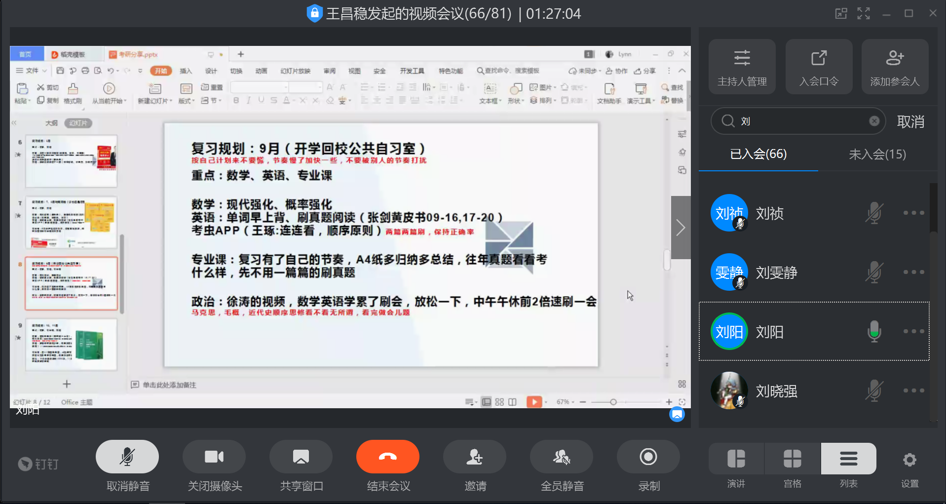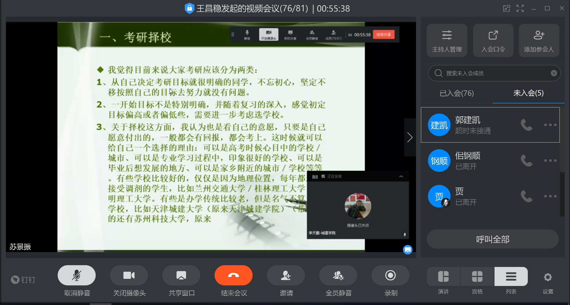 2020年6月17日上午9:00-10:30,我院给排水科学与工程专业采用钉钉视频会议的形式组织召开了2017级考研动员会(既经验交流会)。给排水科学与工程专业全体员工、2017级全体同学及2018、2019级部分同学参加此次视频会议。