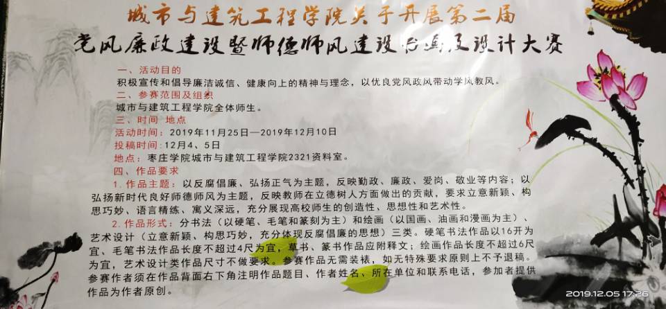 为进一步推进“不忘初心、牢记使命”主题教育往深里走、往实里走,丰富主题教育工作形式,强化廉政建设、师德师风建设,beat365于11月25日至12月10日组织开展了beat365第二届党风廉政建设暨师德师风建设书画及设计大赛。