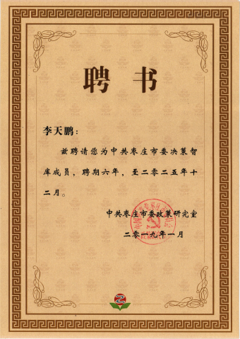 近日,城建beat365李天鹏博士被中共枣庄市委政策研究室聘请为中共枣庄市委决策智库成员,聘期为2019.01-2025.12。受聘后,李天鹏博士将充分发挥自身专业背景和技术优势,主动当好政府部门的参谋和助手。 枣庄市委决策智库成员受委托就我市创新转型持续发展重大政策和重点项目建设等事项提出对策、意见和建议;应邀开展调查研究、专题研讨、专题讲座、决策咨询等活动,为市委决策提供科学依据;按照本人专业所长,结合枣庄实际,开展调查研究,为全市经济社会发展建言献策等。