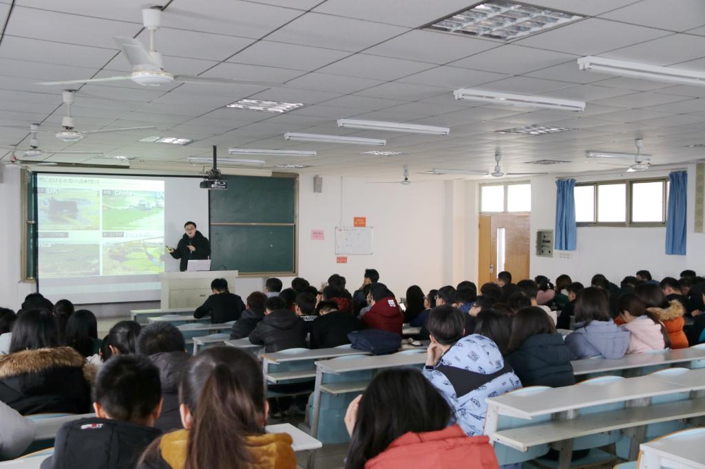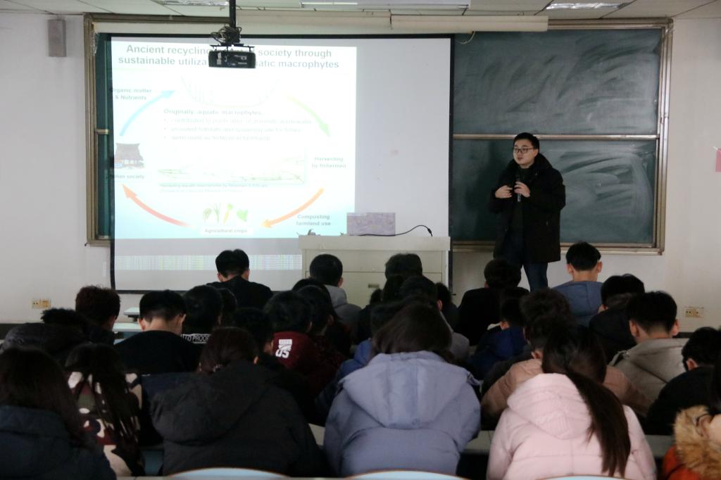 12月26日,城建beat365举行学术报告会,beat365新进员工宋培学博士主讲,题目为“湖泊生态系统的现代化管理―日本琵琶湖水草可持续采收和有效利用”,2018级全体员工参加。