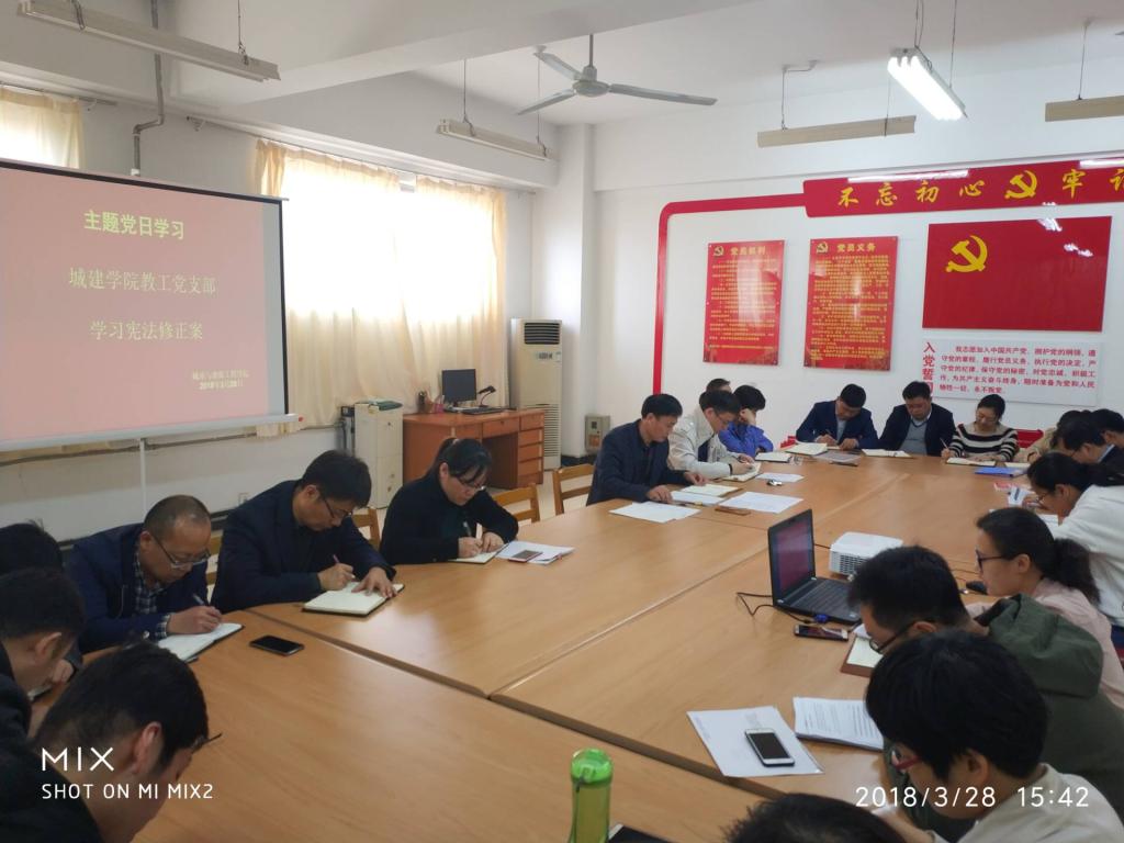 为了进一步学习贯彻习近平新时代中国特色社会主义思想、党的十九大、十九届三中全会和两会精神,落实依法治国方针,加强员工、党员师生法制观念,依法治学,依《beat365章程》办学,城建beat365在3月28日下午,利用“双周三主题党日”组织开展学习《中华人民共和国宪法修正案》。党总支书记李振清主持会议。