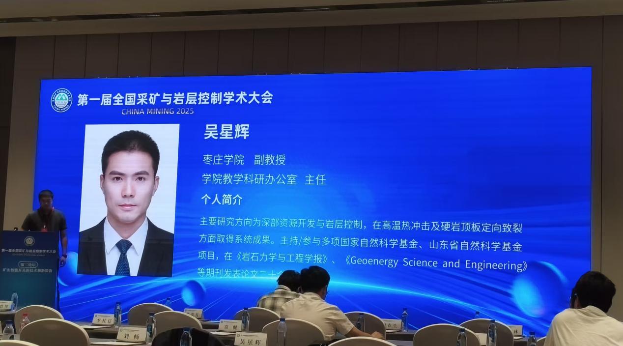 会议期间,吴星辉副教授在大会上作了题为《高温热冲击作用下深部硬岩强度演化与非线性破坏准则》的专题学术报告。报告系统展示了我院在深部硬岩热损伤机理、微观结构演化及非线性强度准则等方面的最新研究成果,相关结论为深部地热资源开发、煤矿硬岩顶板中的岩体稳定性评估与工程安全提供了重要的理论依据,引起了与会专家的广泛关注和热烈讨论。张淑坤教授作为我院学术带头人之一,积极参与了大会的各项学术交流活动,与同行专家就深部资源开发、矿山灾害防治等前沿课题进行了深入探讨,扩大了我院在相关研究领域的学术影响。