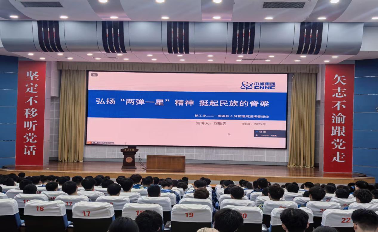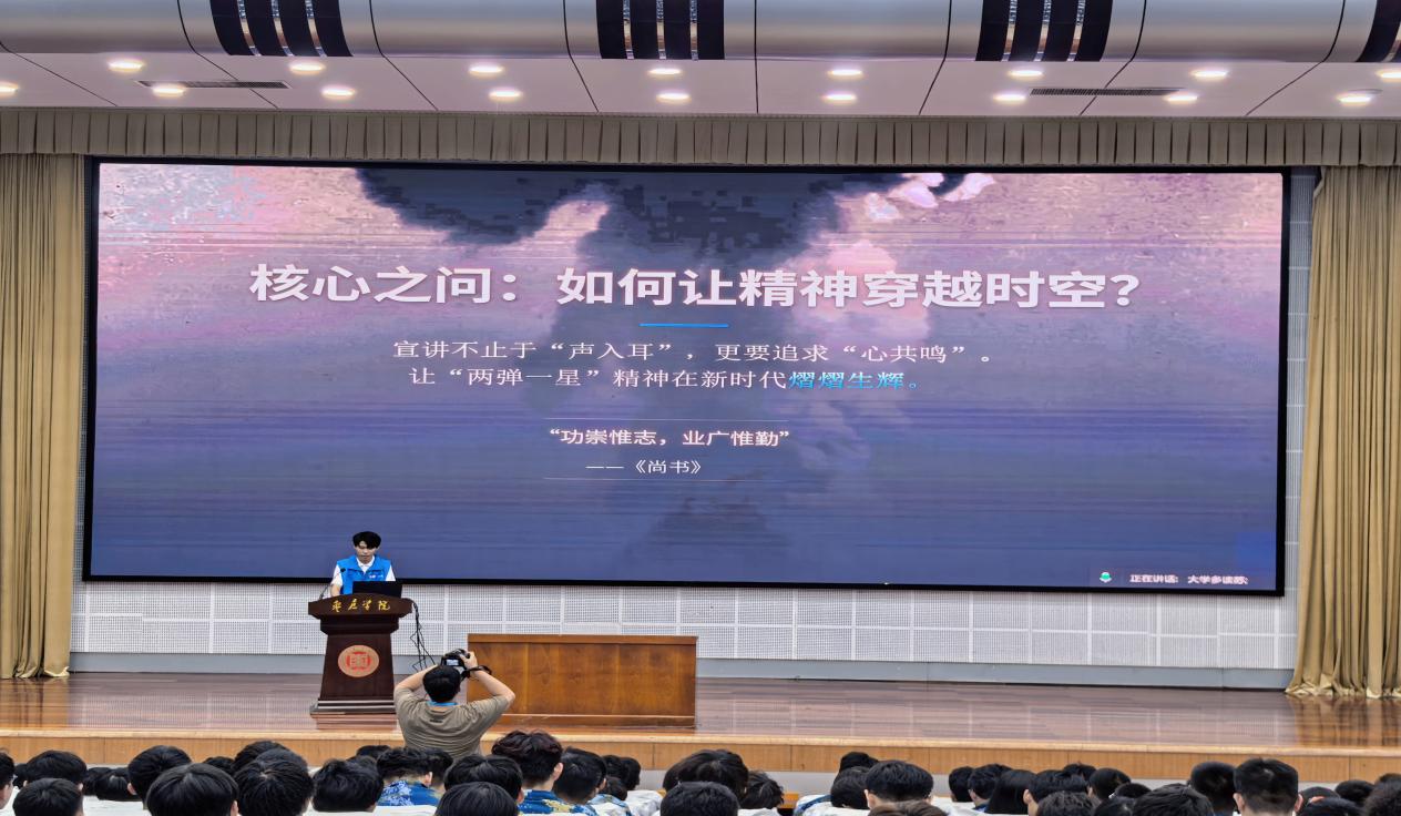 活动特别邀请到中核集团“两弹一星”精神志愿宣讲辅导员、二二一局宣讲员刘胜男老师进行线上宣讲。她通过真实感人的历史故事,深情回顾了“两弹一星”研制过程中老一辈科技工作者无私奉献、艰苦奋斗的峥嵘岁月,为在场师生带来一场深刻的精神洗礼。这场跨越空间的连线,不仅拓宽了宣讲的广度,更提升了内容的感染力,为“两弹一星”精神在校园中的传播与扎根提供了鲜活载体和持续能量。
